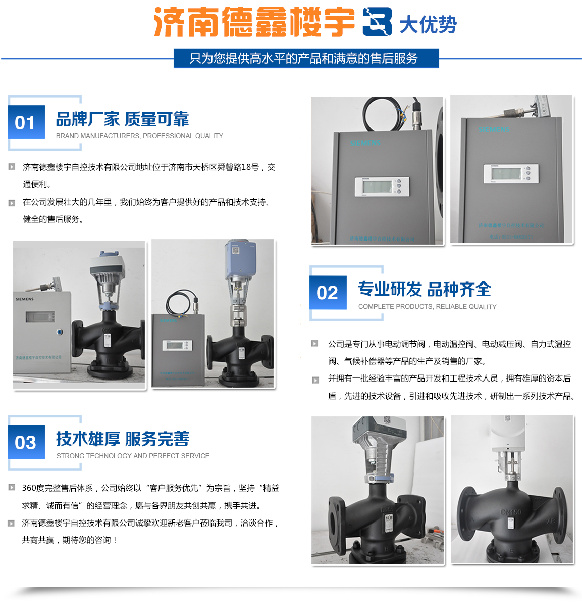 濟(jì)南德鑫樓宇自控技術(shù)有限公司是專門從事電動(dòng)調(diào)節(jié)閥,電動(dòng)溫控閥、電動(dòng)減壓閥、自力式溫控閥、氣候補(bǔ)償器等產(chǎn)品的生產(chǎn)及銷售。濟(jì)南德鑫樓宇自控技術(shù)有限公司擁有一批經(jīng)驗(yàn)豐富的產(chǎn)品開(kāi)發(fā)和工程技術(shù)人員,擁有先進(jìn)的技術(shù)設(shè)備,引進(jìn)和吸收先進(jìn)技術(shù),研制出一系列技術(shù)產(chǎn)品。